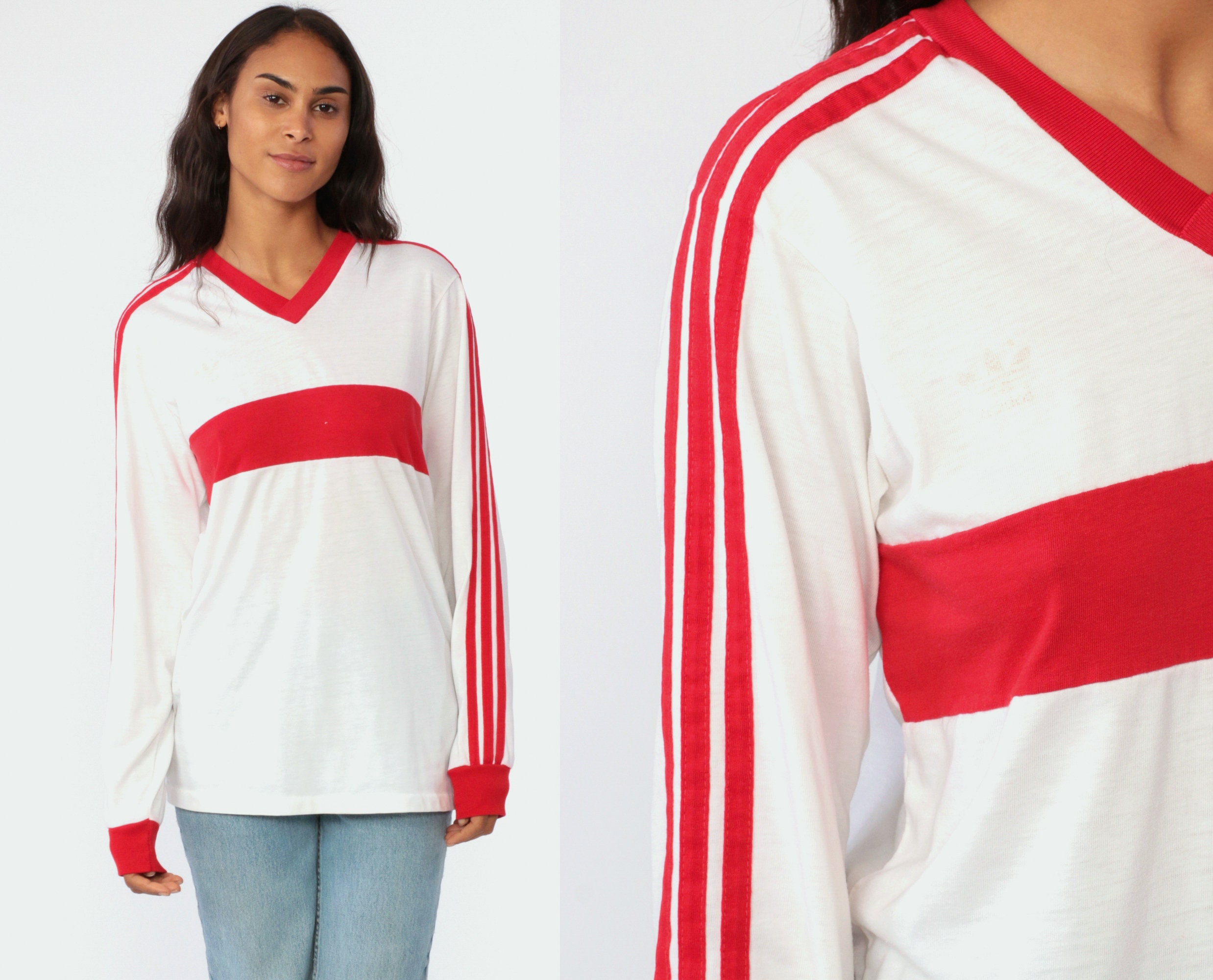 Adidas Soccer Shirt 80s Long Sleeve White Striped Ringer Tee Red Football 1980s Sportswear Vintage Retro V Neck Tee Futbol Small Medium Usa Basketball Jersey Uk